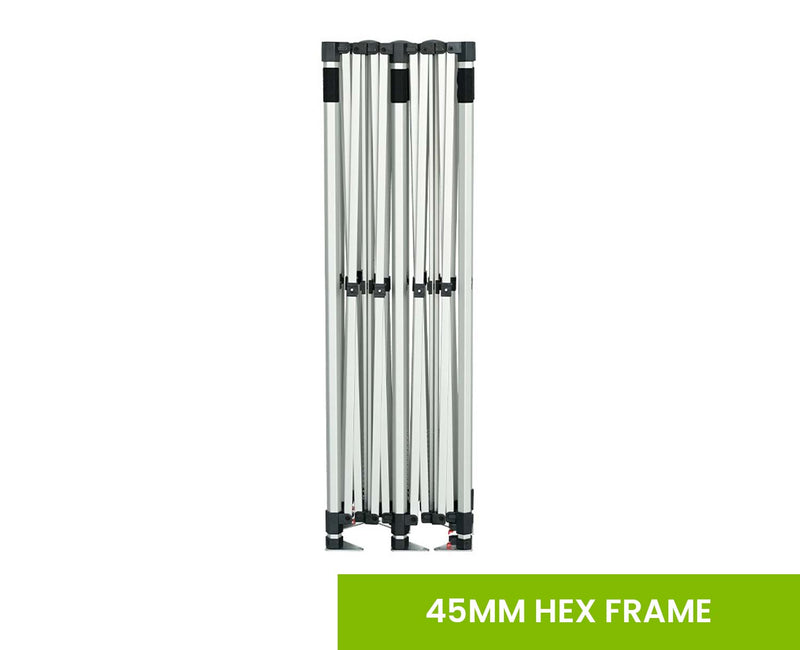 Our marquees feature a 45 mm snap-lock aluminium hexagon frame with 1.1 mm anodised aluminium tubing, Easy-Glide Tent Feet that slide easily on dirt or grass. They're built to be strong, durable, and reliable.